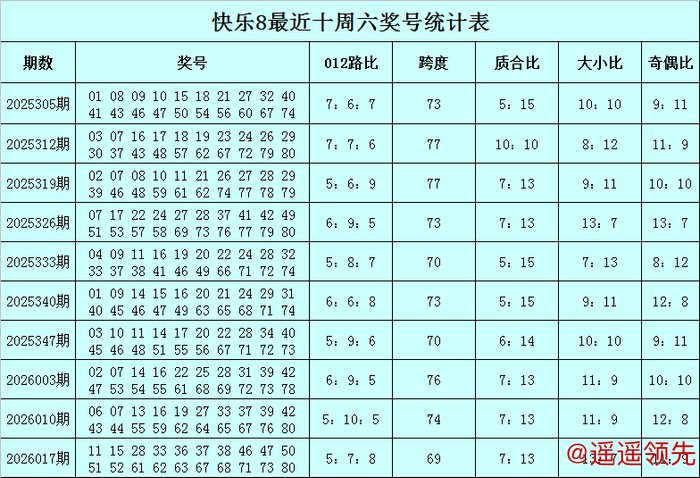 福彩快乐8第2026017期(上周六)开奖回顾:11 15 28 33 36 37 38 46 47 50 51 52 61 62 63 67 68 71 73 80,其中奖号012路比为5:7:8,跨度为69,质合比为7:13,大小比为13:7,奇偶比为11:9。